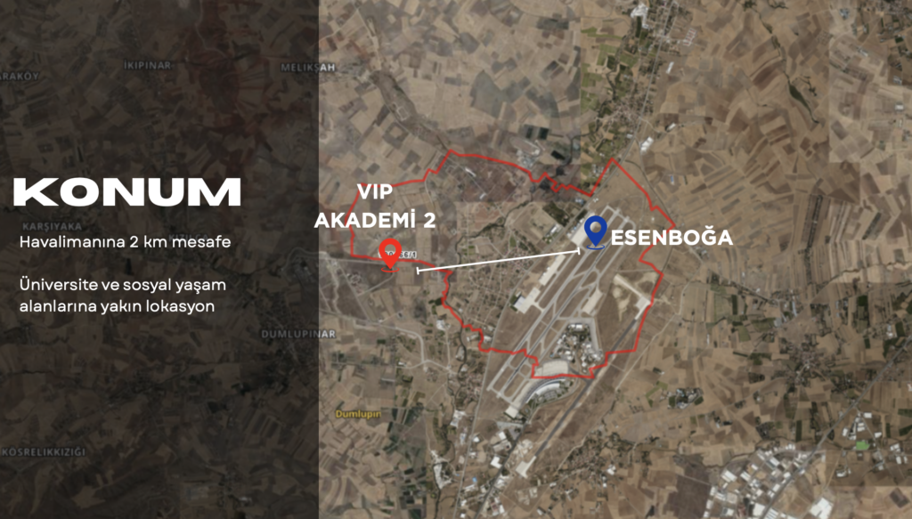 Esenboğa Havalimanı’na 2 km mesafede, üniversite, sosyal yaşam ve eğitim alanlarına yakın, bölgenin gelişim aksı üzerinde yer alan stratejik bir konuma sahiptir.
